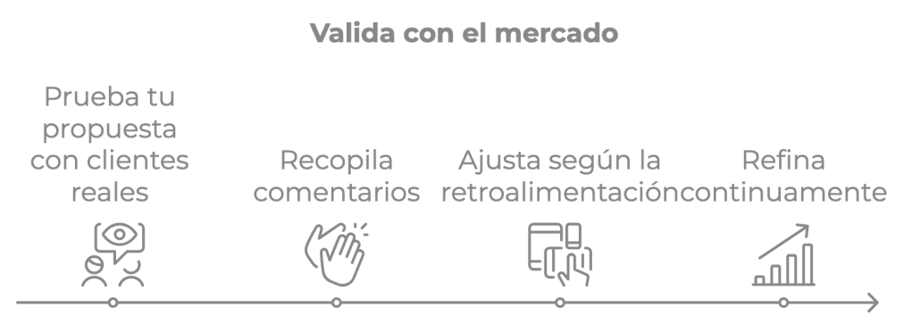 Encontrar junto con tus equipos esa propuesta de valor que haga que el producto sea diferente al de la competencia y que además compita en un segmento de mercado diferente es un proceso crucial. No se trata solo de ser diferente por ser diferente, sino de crear valor significativo para un segmento específico del mercado.